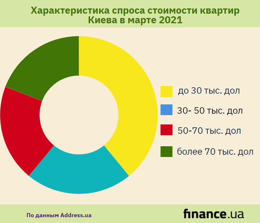Спрос. В марте самым высоким спросом пользовались квартиры в ценовом диапазоне от 50 000 до 70 000 дол. США с долей запросов 45%. На втором месте находилось жилье в диапазоне до 30 000 дол. США с долей 36% от общего количества запросов к базе данных портала Address.ua. Спрос на жилье с ценой 30 000 – 50 000 долл. США в марте 2021 г. составил 12% запросов к базе данных портала.