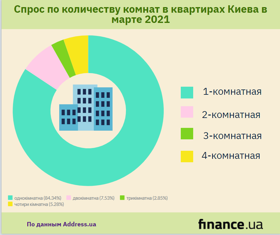 Спрос на однокомнатные квартиры в марте 2021 г. был самым высоким по сравнению с другими группами жилья и составил 44,7%. 39,9% запросов пользователей портала Address.ua были сосредоточены в категории 2-комнатных, трехкомнатными квартирами в феврале 2021 года интересовались 15,1% пользователей, ищущих недвижимость для покупки.