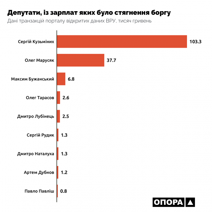 Получатели средств. Согласно расходам, размещенным на портале открытых данных Верховной Рады, Гражданская сеть ОПОРА подсчитала суммы средств, которые были направлены в пользу парламентариев. В частности, это заработная плата, проживание, средства на выполнение депутатских полномочий, проезд по Украине, отпуск и тому подобное.