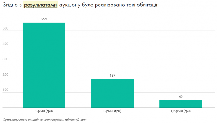 Наибольший спрос был сосредоточен на 1-летних бумагах, от размещения которых в государственный бюджет было привлечено 552,6 млн гривен. Минфин удовлетворил 29 из 30 заявок по годовым бумагам и все заявки по ОВГЗ сроком 1,5 и 3 года.