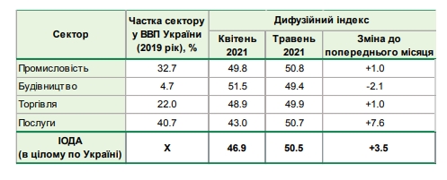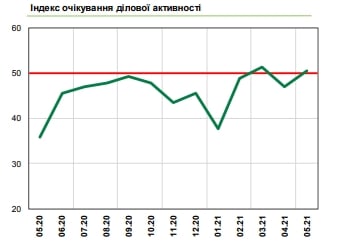 Украинский бизнес в мае 2021 года улучшил оценки экономического состояния своих предприятий и перспектив деятельности. Индекс ожиданий деловой активности (ИОДА) вырос до 50,5 пунктов и уже во второй раз с начала года превысил равновесное значение (50 пунктов).