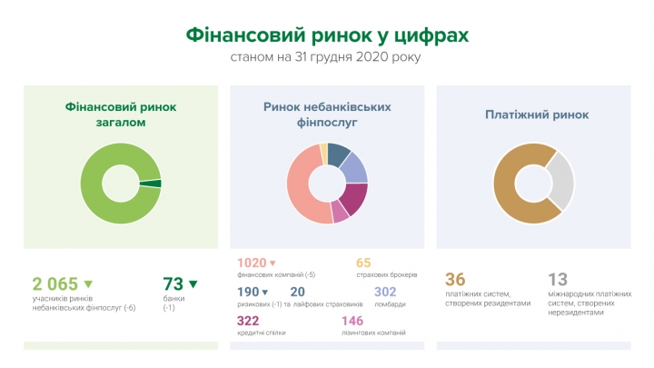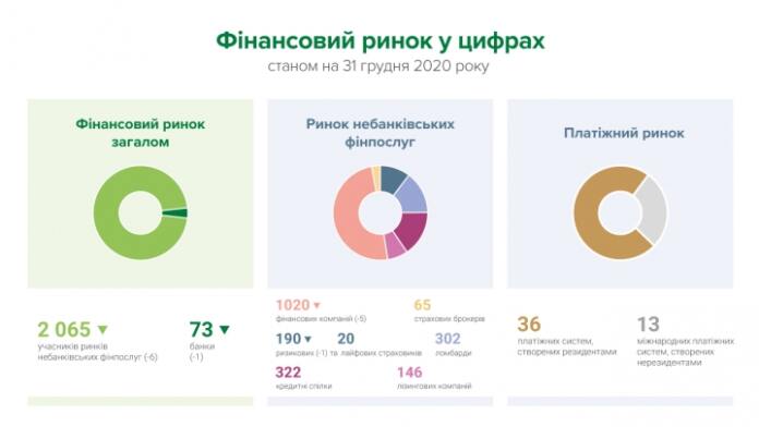 По состоянию на 31 декабря 2020 года в Украине действуют 73 банка и 2065 участников рынков небанковских финансовых услуг.