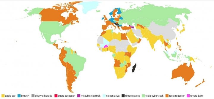 На втором месте Tesla Cybertruck (7,296 млн глобальных запросов и первое место в 22 странах), а на третьем — Apple Car (5,88 млн запросов и первое место в 54 странах). В топ-10 также вошли BMW i4, Chevy Silverado, Cadillac Lyriq, Nissan Ariya, Ford F-150 Lightning, Rimac Nevera и Mercedes-Benz EQE.