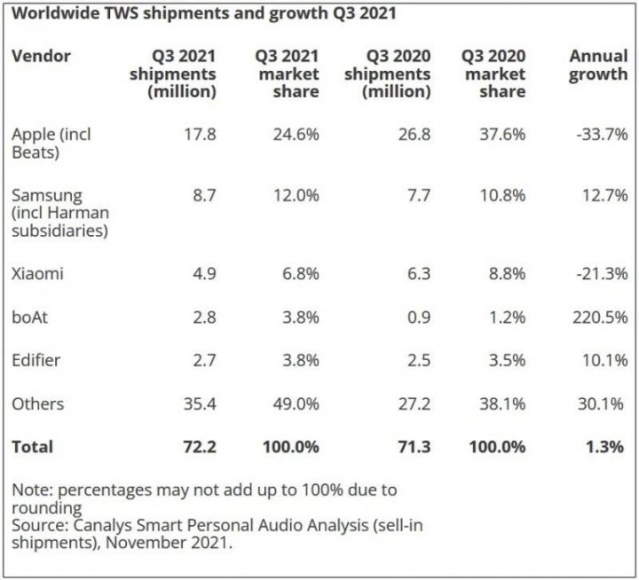 Эксперты Canalys отмечают, что конкуренция между производителями TWS-гарнитур лишь будет расти, поскольку такие компании как Jabra, Sony и JBL регулярно обновляют свой ассортимент, предлагая новинки в различных ценовых категориях. Суммарно по рынку в третьем квартале 2021-го было реализовано 72,2 миллиона TWS-наушников, что на 1,3% выше показателей 2020 года.