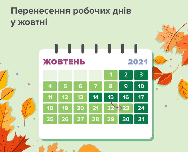 В октябре 2021 года в связи с празднованием Дня защитников и защитниц Украины рабочий день с пятницы 15 октября переносится на субботу 23 октября.