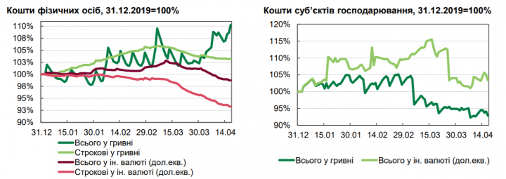 «Снижение стоимости срочных гривневых вкладов, которое продолжалось с декабря 2019 года с середины марта затормозило, отражая неуверенность вкладчиков», — говорится в отчете НБУ.