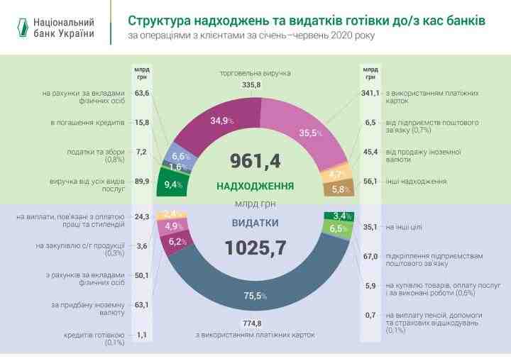 Объем поступлений наличных денег в кассы банков за этот период составил 961,4 млрд грн. Это на 11,8% меньше, если сравнивать с первым полугодием 2019 года.