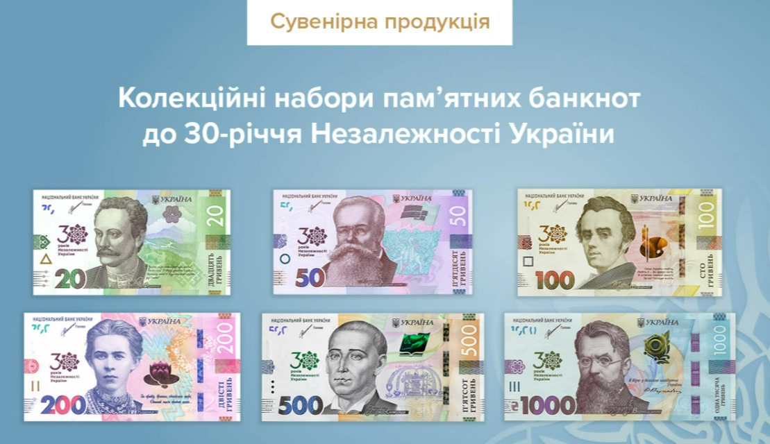 Национальный банк Украины 17 января 2022 года выпускает коллекционные наборы памятных банкнот к 30-летию Независимости Украины в кляссерах (2 000 штук) и конвертах (3 000 штук).