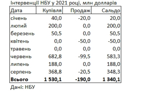 В августе центробанк продолжил интервенции на межбанке. НБУ в основном выкупал излишки валюты. При этом курс доллара к гривне за август почти не изменился (26,8867 гривен за доллар на 31 июля и 26,8601 на 31 августа).