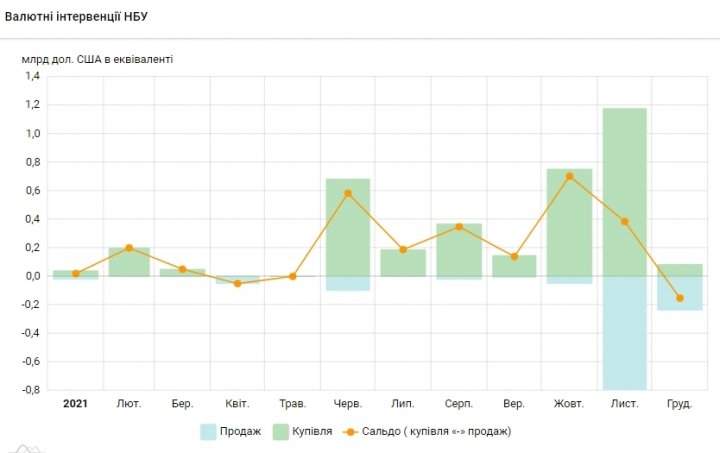 Национальный банк Украины в течение декабря 2021 года купил на межбанковском валютном рынке 84,0 млн долларов и продал 236,5 млн долларов. При этом отрицательное сальдо составило 152,5 млн долларов.