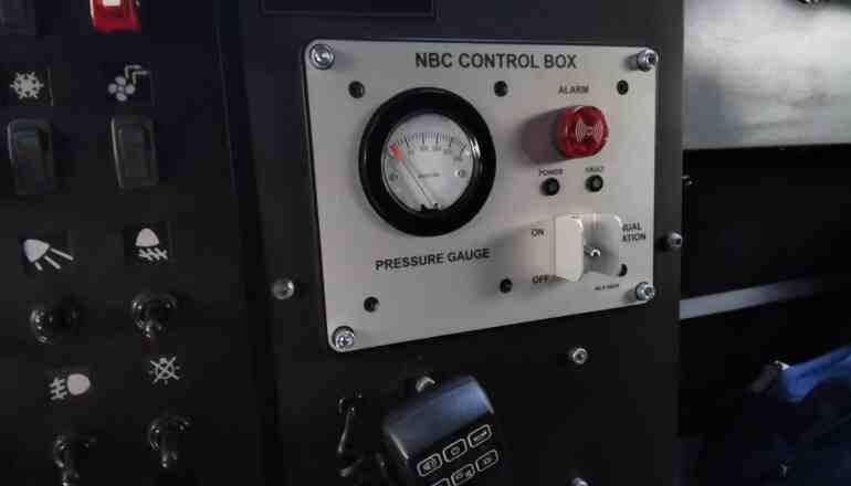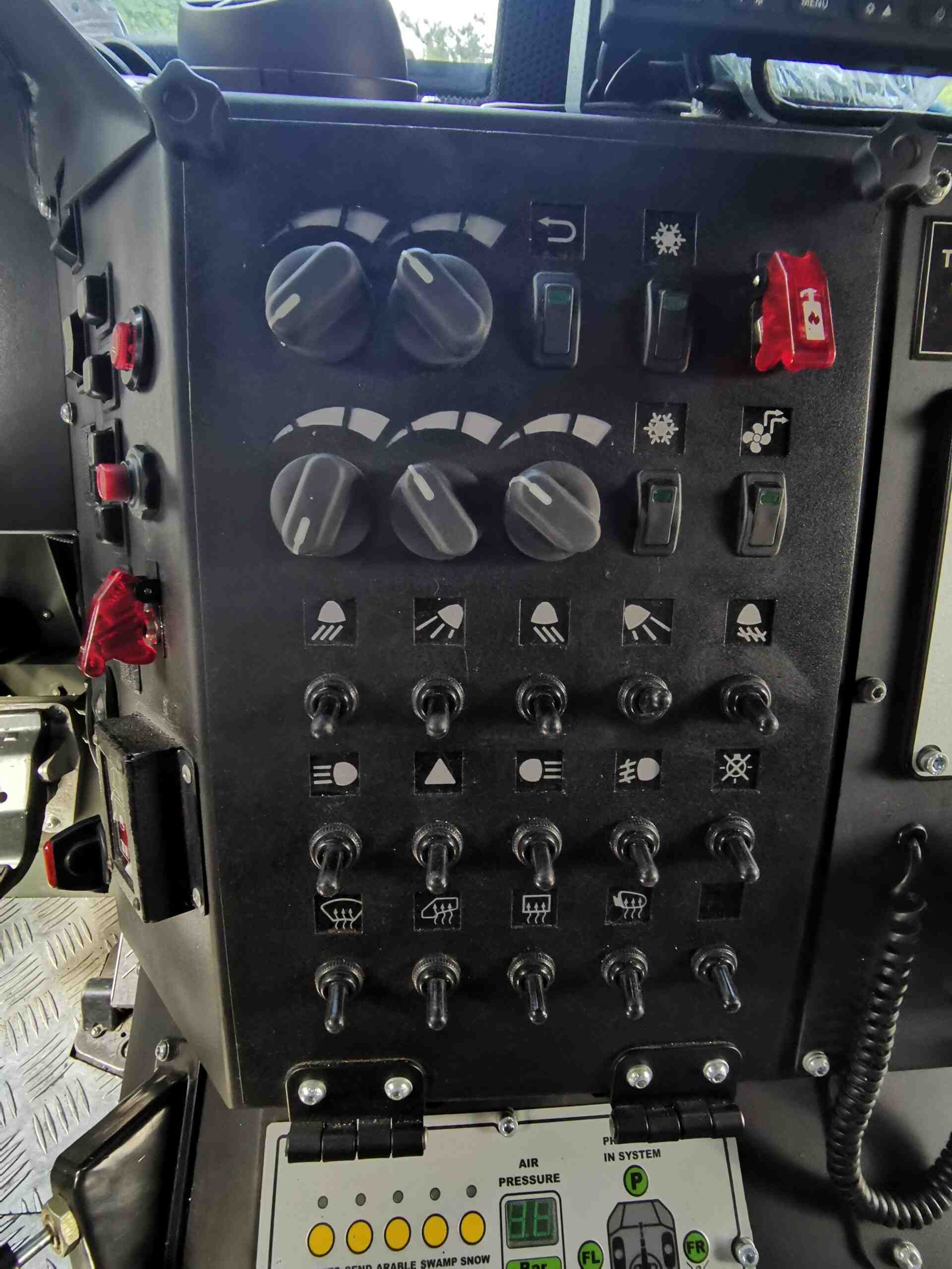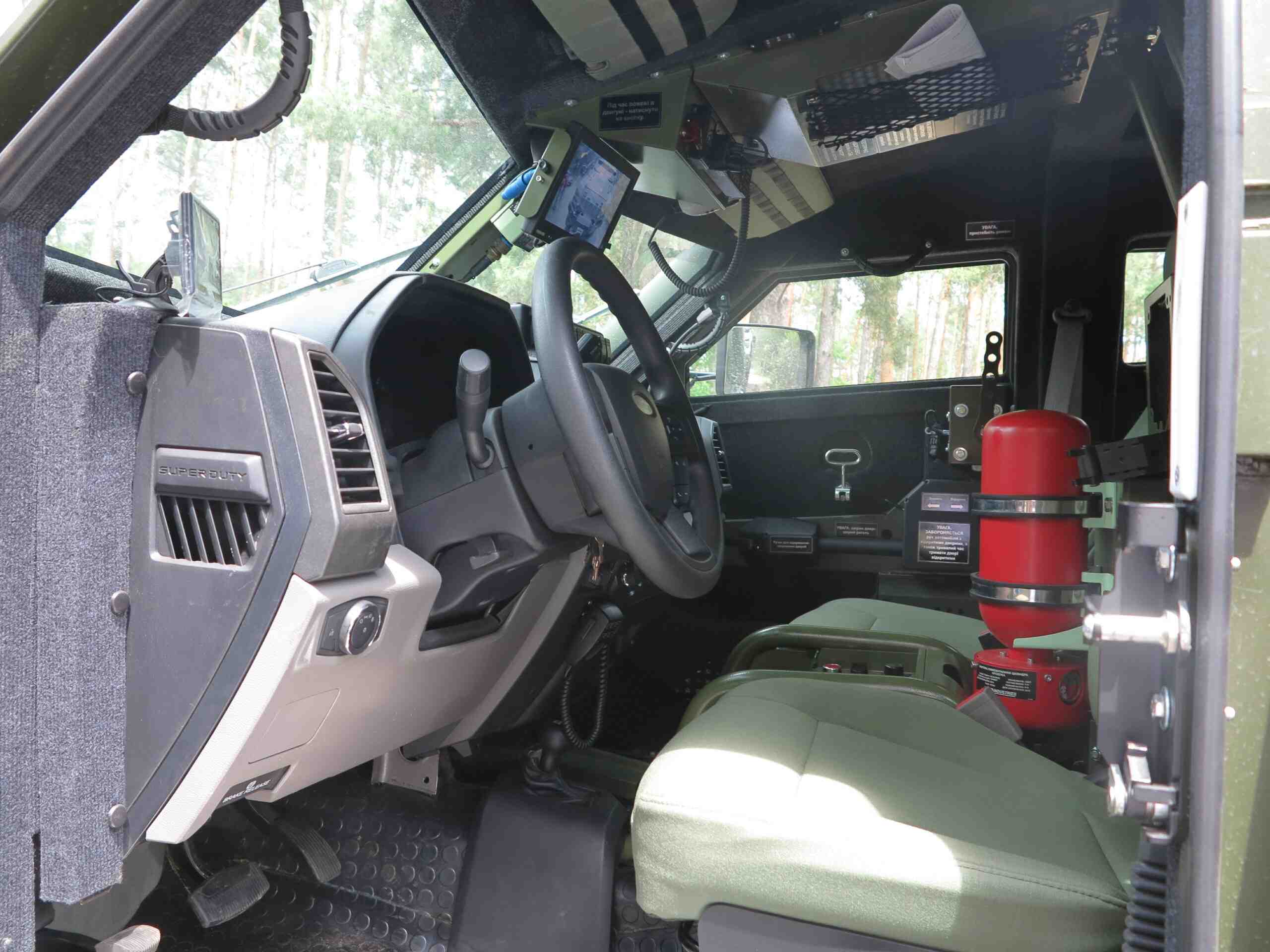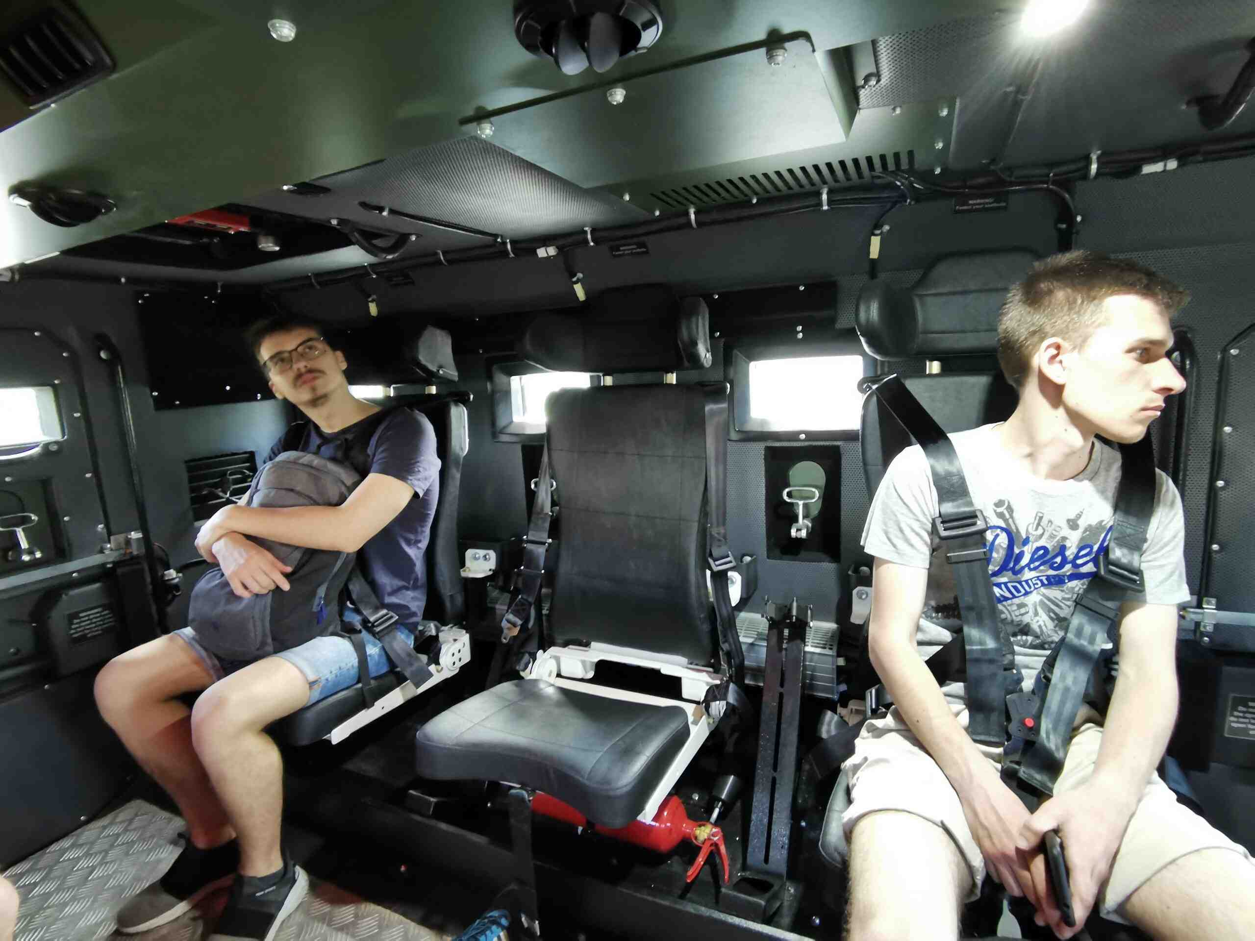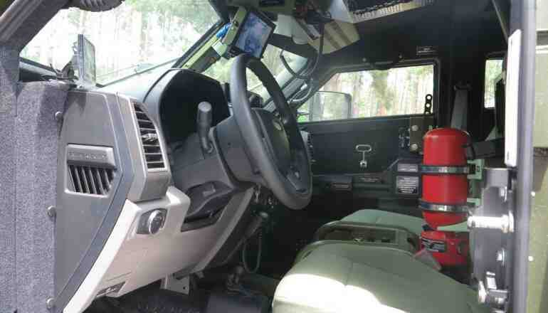 В комплектацию бронеавтомобиля также входит система автоматического пожаротушения, которая защищает экипаж от смеси «коктейль Молотова» и помогает при попадании РПГ. Также отметим наличие фильтровентиляционной установки и мощной системы климат-контроля, эффектность которой мы оценили при забортной температуре +32С. Машина также может комплектоваться тепловизионным комплексом с определением человека на расстоянии до 4 км, а автомобиля – до 7 км.