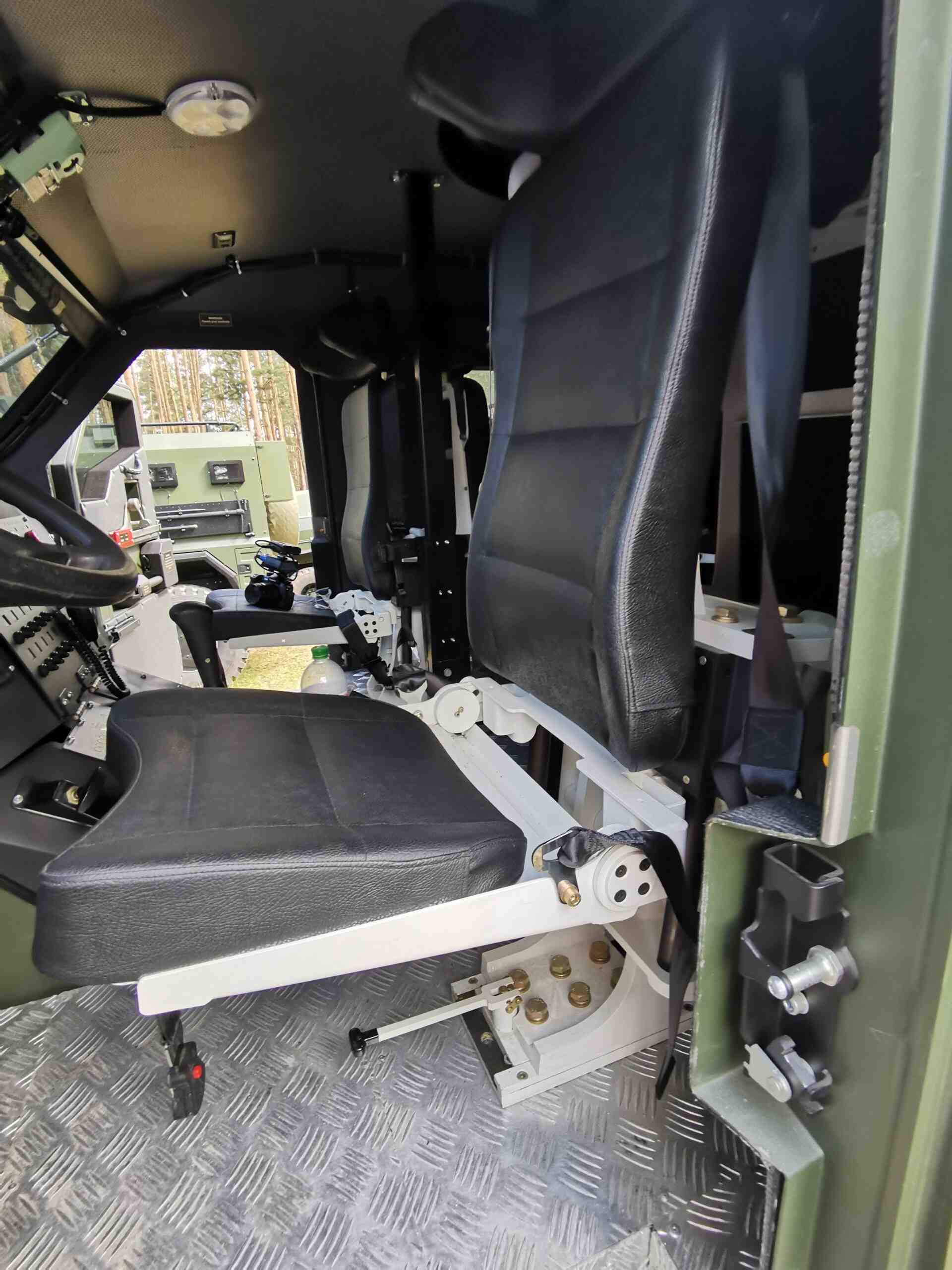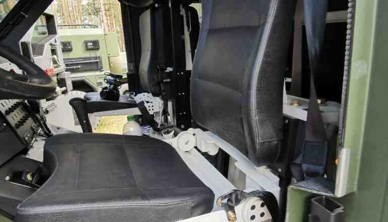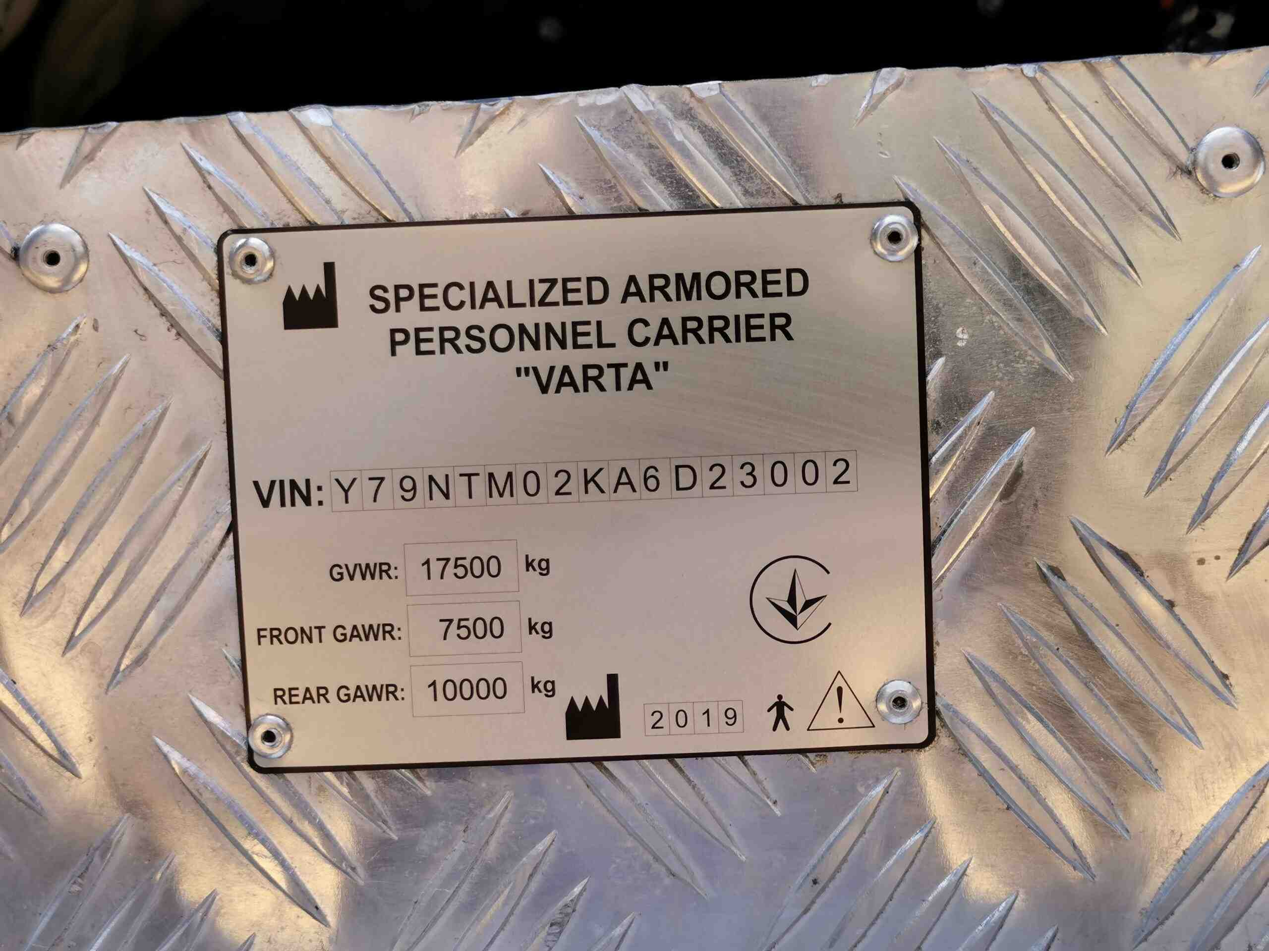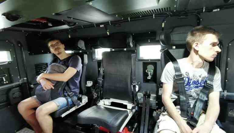 Первым нашим подопытным стал бронеавтомобиль «Варта», построенный на доработанном полноприводном шасси МАЗ-5434 (4х4). Машина полной массой 17,5 т предназначена для перевозки 2+8 человек. Кузов изготовлен из шведской стали марки 560 и обеспечивает класс защиты STANAG 4569 Level 2 – от пули Б3 калибра 7,62 мм. На машина усиленная противоминная защита – V-образное днище позволяет выдерживать подрыв мощностью до 6 кг в тротиловом эквиваленте. Особо хочется отметить специальные противоминные сиденья, не имеющие жесткой связи с полом и оснащенные 5-точечными ремнями.