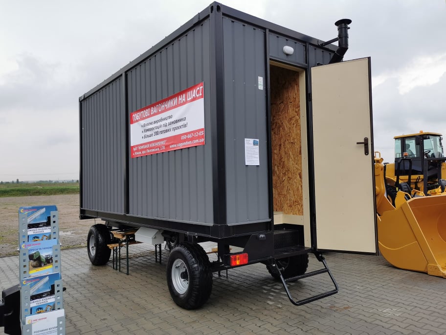 Новинкой 2021 года является вагончик на шасси с печкой-буржуйкой – т. н. «бытовка». Он не требует фундамента и используется как столовая, место для проживания, мобильный офис и др. Для транспортировки необходим трактор или автомобиль сфаркопом. Габаритные размеры вагончика (без шасси): длина – 5,0 м; ширина – 2,3 м и высота – 2,6 м. Жилая площадь – 11 м кв. Фургончик изготовлен на шасси тракторного прицепа 2ТСП-6.