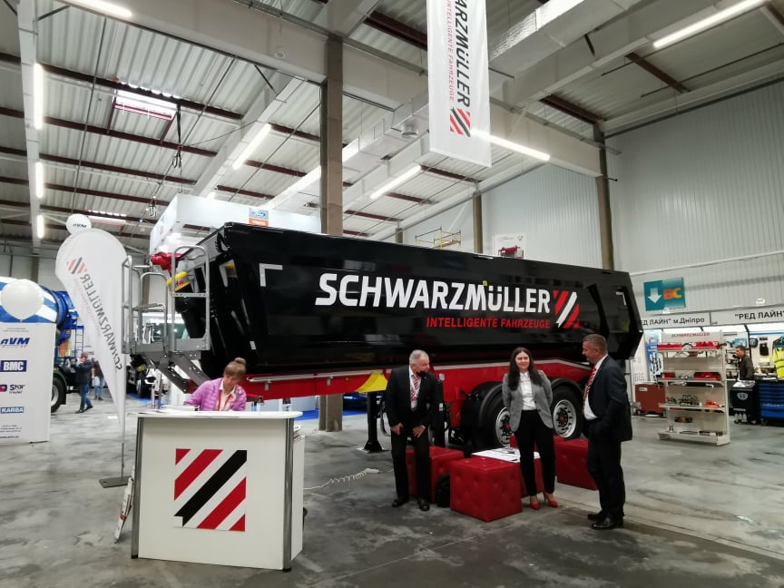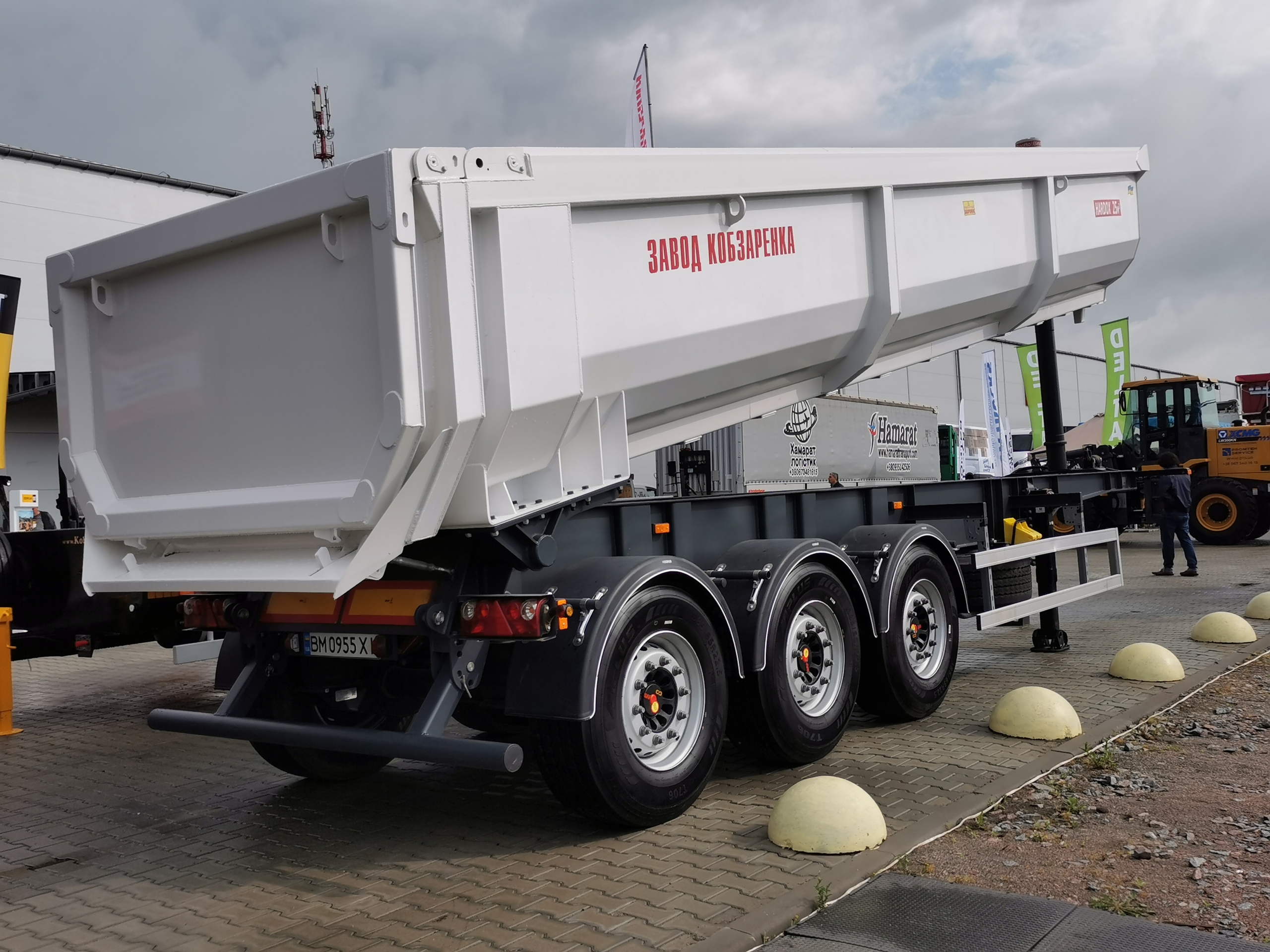 Прицепная техника на выставке «HD Технополигон» также экспонируется и в павильоне. Так, компания «Шварцмюллер Украина» представляет самосвальный трехосный полуприцеп с объемом кузова 27 кубометров. Здесь установлены 9-тонные оси.