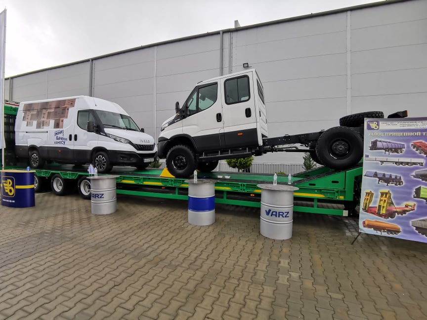 Начнем с продукции Завода прицепной техники ВАРЗ из города Верхнеднепровск, Днепропетровской области. На выставке можно увидеть трейлер-тяжеловоз, представленный официальным дилером IVECO в городе Днепр – компанией «Оникс». И не случайно на нем стоят автомобили IVECO Daily.