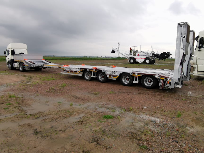 Также есть низкорамные тралы с раздвижной рамой. Начнем с трехосной модели – для перевозки крупногабаритной сельхозтехники – например, посевных комплексов или комбайна с жаткой.