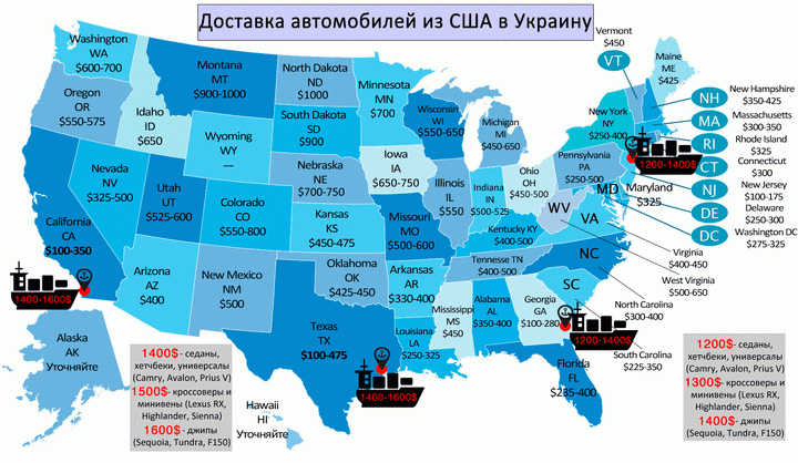 До сих пор расходы на транспортировку по США таможня считала унифицированно – по 400 долларов за каждый автомобиль. Однако на самом деле эта стоимость не соответствует действительности, так как в зависимости от удаленности порта США (или другой страны) она может составлять 700-1300 долларов США. Чтобы более точно определить стоимость автомобиля (а с ней и сумму начислений налогов), таможня на 51 странице разослала своим подразделениям приложение со стоимостью транспортировки автомобилей от крупнейших перевозчиков из разных портов Украины.