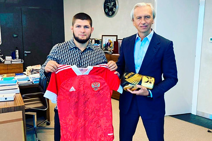 32-летний Нурмагомедов поделился совместным фото с главой отечественного футбола. В руках бойца можно увидеть подарок от Дюкова — футболку национальной команды России.
