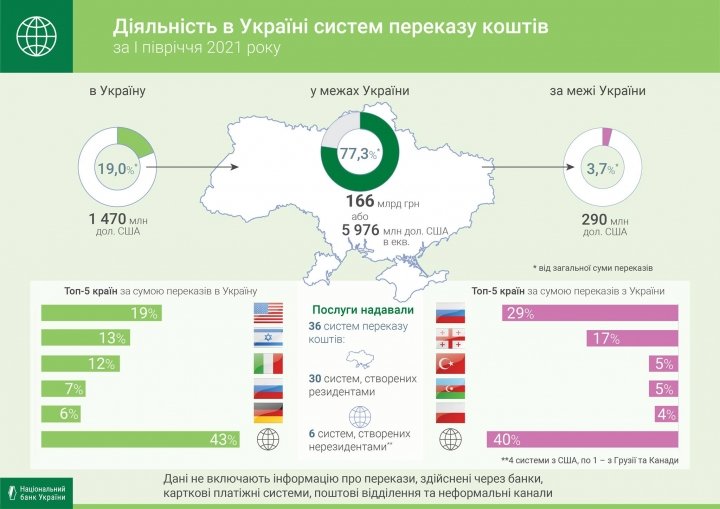«Украина остается страной-реципиентом трансграничных переводов. В течение первого полугодия 2021 года сумма средств, полученных в Украине с использованием международных систем перевода средств, в пять раз превышает сумму средств, отправленных за ее пределы», — говорят в Нацбанке.