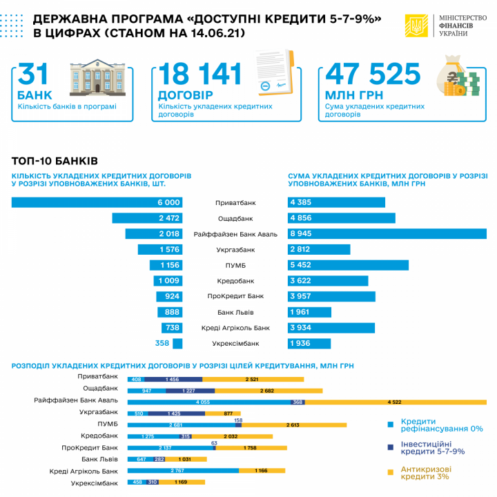 Из них 18,587 млрд грн выданы в качестве рефинансирования полученных ранее займов, 6,04 млрд грн предприниматели получили на инвестиционные цели и 22,724 млрд грн — в качестве антикризисных кредитов.