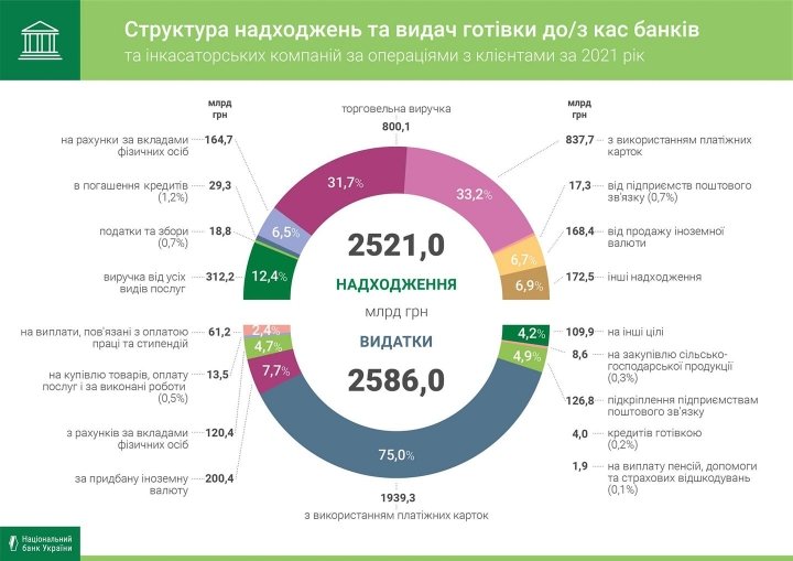 2521 млрд грн – объем поступлений наличности в кассы банков – это на 19,1% больше, чем в 2020 году;