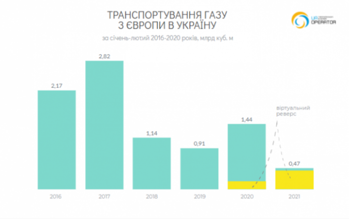 За январь-февраль 2021 года объемы транспортировки газа из ЕС в Украину составили 468 млн куб. м: из Польши – 91 млн куб. м, Словакии – 65 млн куб. м, Венгрии – 403 млн куб. м. Виртуальным реверсом (backhaul) импортировано 86%, или 403 млн куб. м. Практически весь газ был направлен для использования на внутреннем рынке Украины. Услугу заказали 18 трейдеров, из них 5 украинских компаний и 13 иностранных.