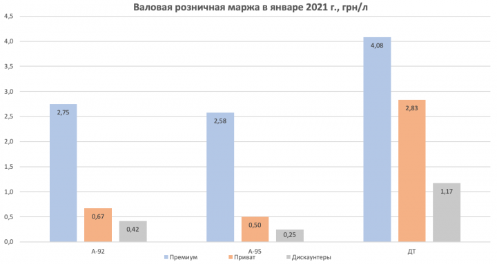 В результате по состоянию на 25 января расчетная наценка в сети дискаунтеров на бензин А-92 составила 0,42 грн/л, на бензин А-95 — 0,25 грн/л и 1,17 грн/л на дизтопливо (все значения без НДС).