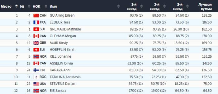 Олимпийской чемпионкой в этой дисциплине стала китайская фристайлистка Гу Айлин. За свое выступление девушка суммарно набрала 188,25 балла.