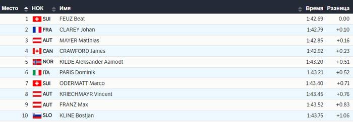 Победителем стал швейцарский спортсмен Беат Фойц. 34-летний спортсмен ранее никогда не выигрывал олимпийское золото. На ОИ-2018 у него было две медали – серебро в супергиганте и бронза – в скоростном спуске.