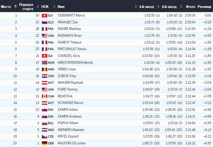 Победу одержал швейцарский горнолыжник Марко Одерматт, итоговое время которого составило 2:09.35.