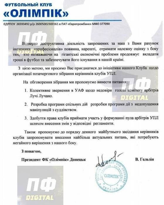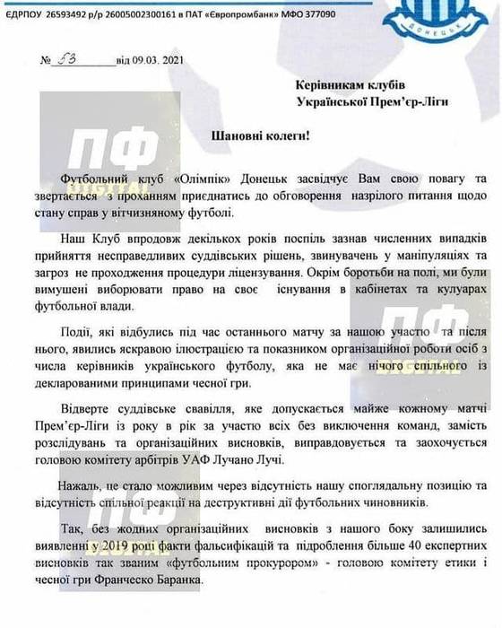 Олимпик призвал другие футбольные клубы чемпионата Украины организовать внеочередную встречу руководителей, чтобы рассмотреть вопросы, которые связанные с судейством.