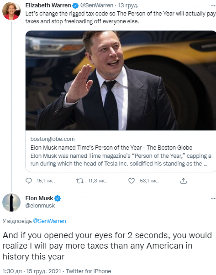 Миллиардер Илон Маск заявил в социальной сети Twitter, что заплатит больше налогов, чем любой американец в истории. Этот аргумент бизнесмен использовал в очередной ссоре с сенатором от Массачусетса Элизабет Уоррен.