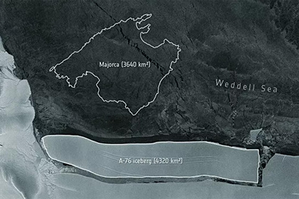 Известно, что размеры гигантской льдины составляют 170 километров в длину и 25 километров в ширину, ее площадь достигает 4320 квадратных километров, что сопоставимо с территорий испанского острова Майорка.
