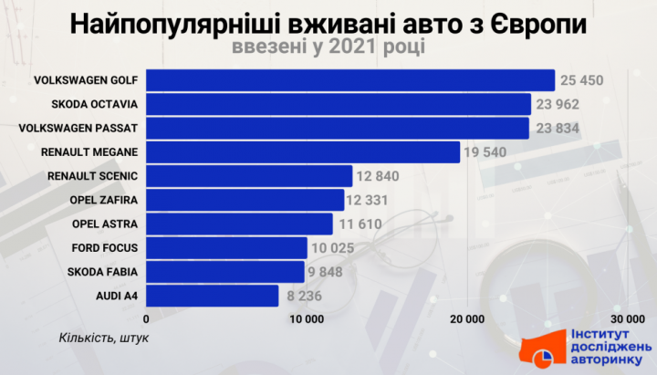 Самым «европейским» автомобилем с пробегом, который привозили из-за границы украинцы в 2021 году, стал Volkswagen Golf. Таких в 2021 году зарегистрировали 25,5 тысяч. На втором месте оказалась Skoda Octavia (24 тыс.), а третье место занял Volkswagen Passat (23,8 тыс.).