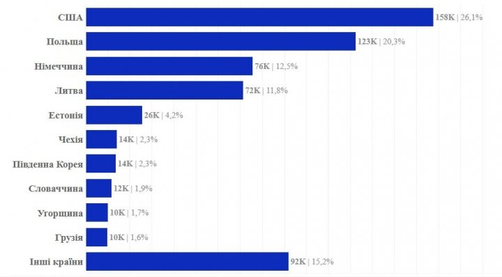 Машин из стран Америки, куда вошли США, Канада и Мексика, было 27% (163 тысячи в количественном измерении). Из других стран украинцы привезли 44 тысячи авто, что составило 7,2% от общего количества.