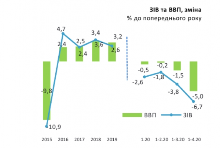 Реальный валовой внутренний продукт (ВВП) Украины в январе-апреле 2020 года сократился на 5,0%. Это существенно больше, чем падение на 1,5% в первом квартале.