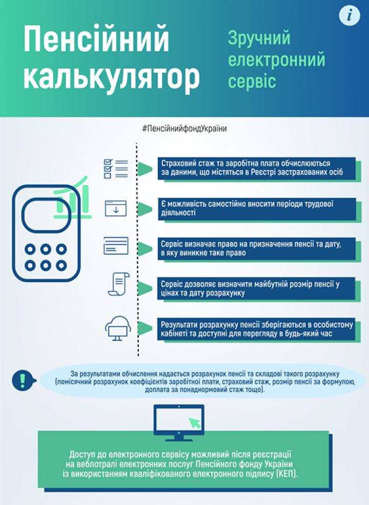 Сервис по результатам расчета стажа (в т. ч. с учетом дополнительно внесенной информации) в соответствии со статьей 26 Закона Украины «Об общеобязательном государственном пенсионном страховании» определяет право на назначение пенсии и дату, в которую возникнет такое право.
