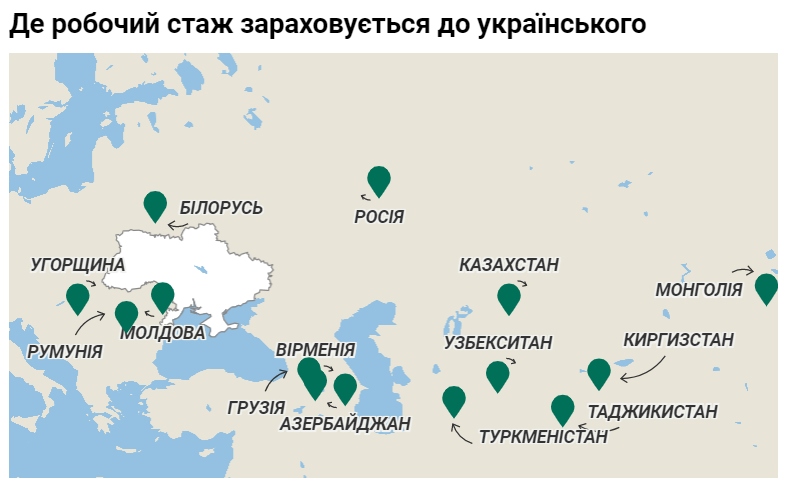 Чтобы получить пенсию в Украине, нужно получить стаж здесь, или в одной или нескольких странах из списка, с которыми Украина имеет договоренность. Это, в частности, Беларусь, Армения, Казахстан, Кыргызстан, Россия, Таджикистан, Туркменистан, Узбекистан, Венгрия, Молдова, Грузия, Азербайджан, Монголия и Румыния. Словом, большинство стран с постсоветского пространства. Такой перечень указан на сайте Министерства социальной политики.