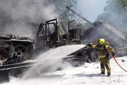 Перевозившие танки тягачи столкнулись на польской автотрассе А6 и загорелись. Об этом сообщает местный портал Wszczecinie.
