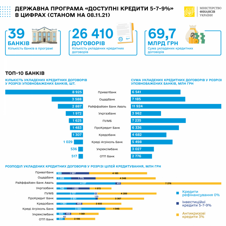 Всего же с момента старта программы «5−7-9%» представители микро, малого и среднего предпринимательства (ММСП) получили от уполномоченных банков 26 410 кредитов на 69,7 млрд грн. Из них 8,38 млрд грн бизнес получил на инвестиционные цели, 39,19 млрд грн — как антикризисную поддержку, 22,18 млрд грн — в качестве рефинансирования полученных ранее займов.