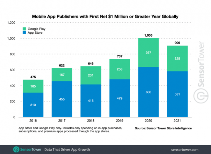 В App Store 636 разработчиков мобильных приложений впервые достигли или превысили показатель в 1 миллион долларов чистой годовой выручки в 2020 году, и эта цифра снизилась почти на 9% в 2021 году, до 581 компании. В Google Play 367 разработчиков пересекли этот рубеж в прошлом году и 325 в этом, их стало на 11% меньше.
