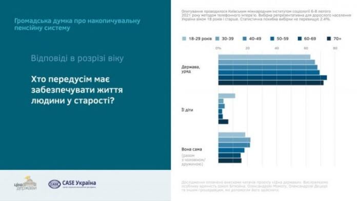 68,5% избирателей считают, что жизнь в старости должно обеспечивать государство и правительство, а 18,8% считают ответственными прежде всего самих себя. В то же время 47,3% украинцев готовы на значительное уменьшение ЕСВ ради получения доходов от сбережений в будущем или расходов на текущие нужды.