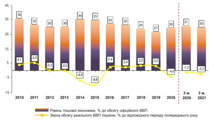 Уровень теневой экономики в Украине в первом квартале 2021 года составил 30% от объема официального валового внутреннего продукта (ВВП) Украины. По сравнению с данными за 2020 год уровень не изменился.