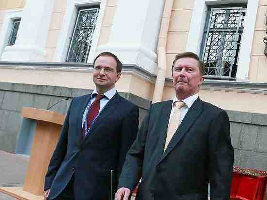 Владимир Мединский и Сергей Иванов на церемонии открытия мемориальной доски Карлу Маннергейму. Санкт-Петербург, 16 июня 2016 года. Кадр из видео.