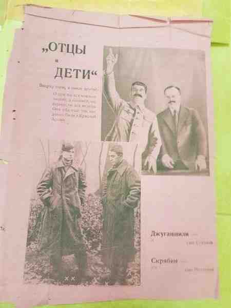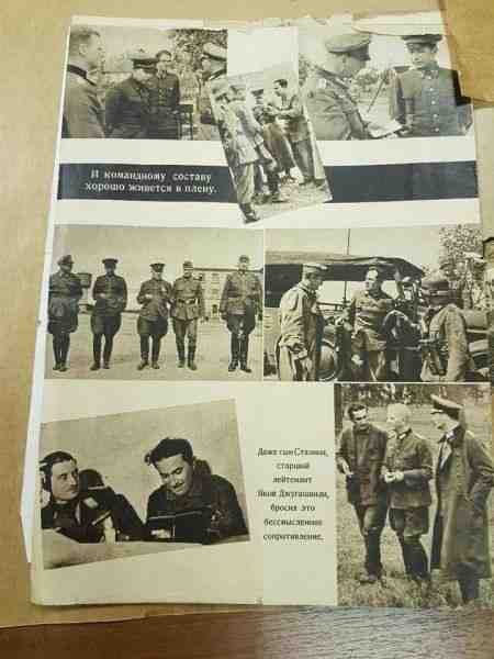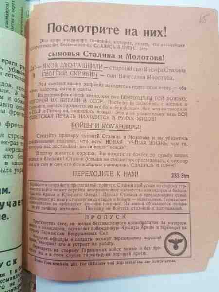 Бенсаад показывает фотокопии агитационных листков того времени, хранящиеся в РГВА. На снимках пленные сыновья вождей — Яков Джугашвили и Георгий Скрябин – якобы сын Молотова. Оба опрятно одеты.
