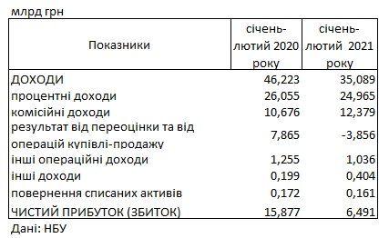 По данным НБУ, доходы банков за январь-февраль 2021 года составили 35,089 млрд гривен, тогда как годом ранее — 46,223 млрд гривен. Отрицательный результат от переоценки и операций купли-продажи составил -3,856 млрд гривен.