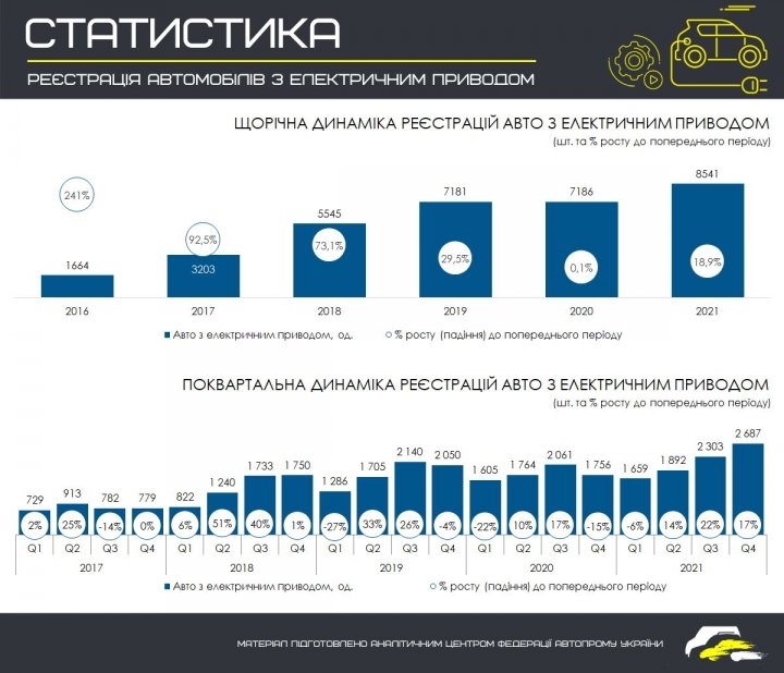По итогам 2021 года в Украине продажи новых и старых электромобилей выросли на 18,9%, лишь немного уступив по темпам роста автомобилям с ДВС (21%).