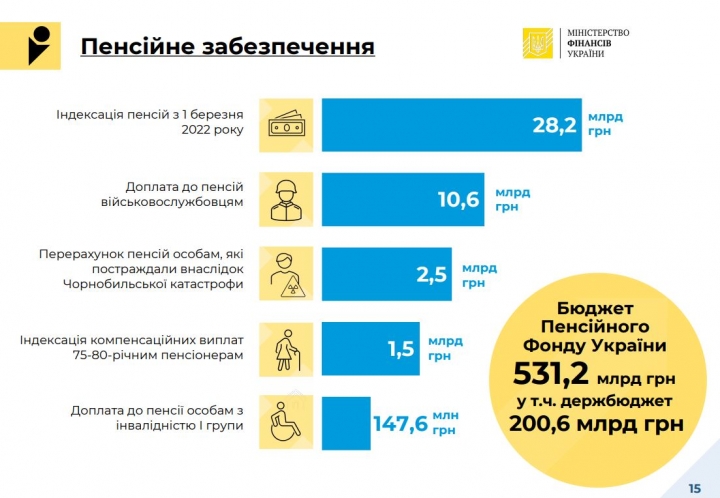 Бюджет Пенсионного фонда Украины, как ожидается, составит 531,2 млрд грн, что на 31 млрд грн превышает показатель 2021 года.
