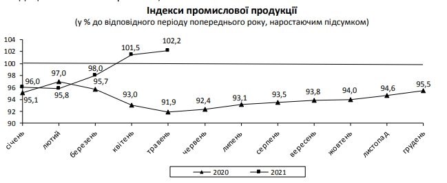По данным статистического ведомства, за январь-май 2021 года рост промпроизводства составил 2,2% (в прошлом году за этот период падение на 8,1%).