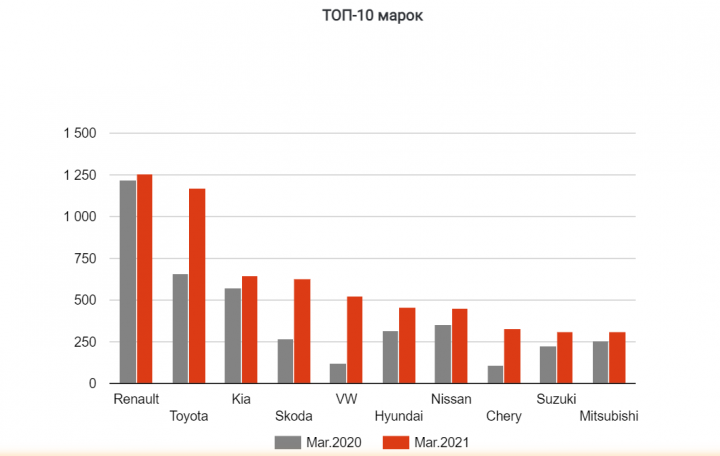 Четвертая позиция у SKODA — 627 авто, что в 2,3 раза больше по сравнению с мартом 2020 г.
